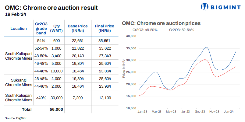 Today at OMC’s chrome ore auction, entire material of 56,000t from South Kaliapani and Sukrangi mines was sold at high premium of around INR 5,500-13,000/t from floor price. Sources reported that aggressive bidding occurred during the auction due to the combination of high demand and limited supply of chrome ore. The bid price has increased by INR 419-4,992/t from Jan’24 auction’s bid price.