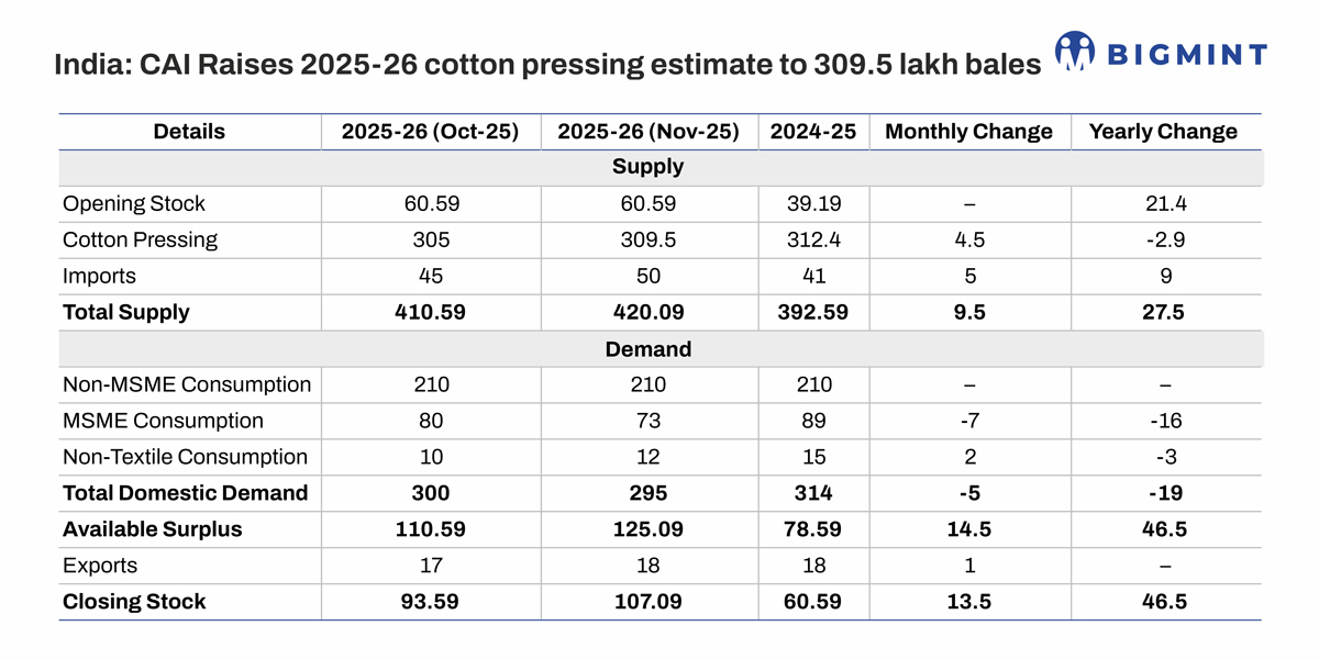 Total cotton supply for the full season is now projected at 420.09 lakh bales, sharply higher than 392.59 lakh bales last year, largely driven by higher production and increased imports.