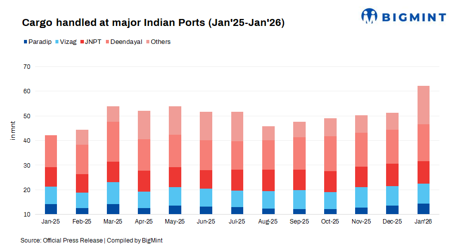 Cargo shipments from key Indian ports rose 8.15% y-o-y to 755.84 mnt in Apr’25-Jan’26, supported by higher coal, petroleum, and container volumes amid steady domestic manufacturing and trade growth.
