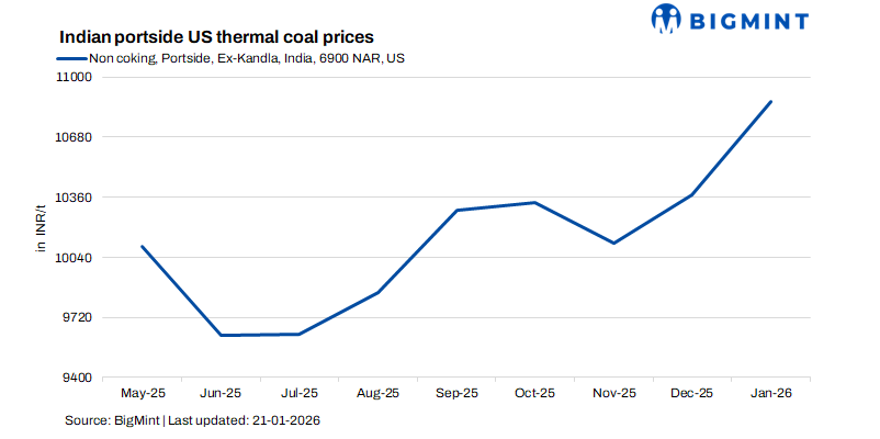 US high-NAR non-coking coal prices ex Kandla and Tuna rose sharply in January, marking one of the steepest short-term price increases seen in India’s retail coal market in recent years. Spot prices at Tuna port climbed from around INR 10,300-10,700/t in early January to INR 12,000-12,050/t by 19-20 January, according to market sources. The speed of the move over 12% in less than two weeks, points to a supply squeeze driven by market structure and positioning, rather than a sudden improvement in underlying demand.