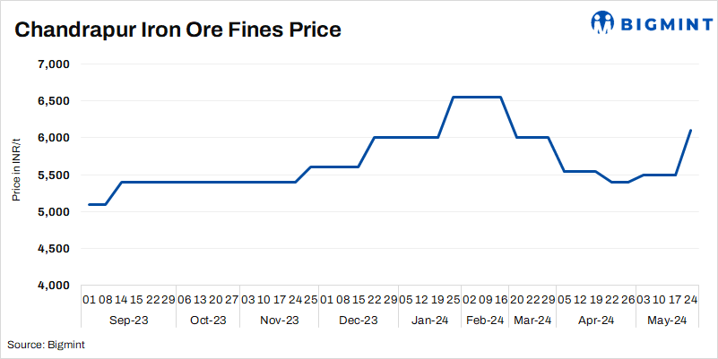 • Iron ore fines (0-10mm, Fe 63%) offers in Chandrapur, Maharashtra, rose by INR 600/t on 24 May’24.