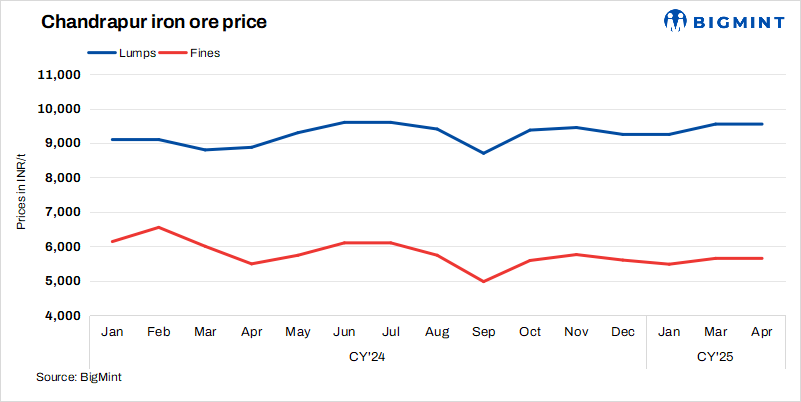 - Iron ore fines (0-10 mm, Fe 63%) offers in Chandrapur, Maharashtra, remained steady w-o-w at INR 5,650/t ($66/t) FOR Balharshah on 18 Apr’25. Meanwhile, lumps were stable at INR 9,550/t ($112) FOR Chandrapur.