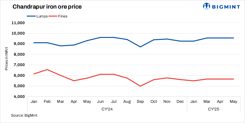 - Iron ore fines (0-10 mm, Fe 63%) offers in Chandrapur, Maharashtra, remained firm w-o-w at INR 5,650/t ($66/t) FOR Balharshah on 16 May’25. Meanwhile, lumps were steady at INR 9,550/t ($112/t) FOR Chandrapur.