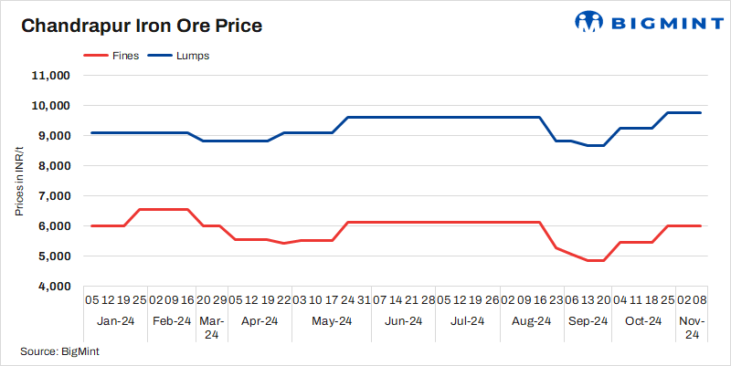 - Iron ore fines (0-10 mm, Fe 63%) offers in Chandrapur, Maharashtra, remained stable w-o-w at INR 6,000/t FOR Balharshah on 8 Nov’24. Meanwhile, lumps (5-18 mm, Fe 63%) offers remained unchanged w-o-w at INR 9,750/t FOR Chandrapur.