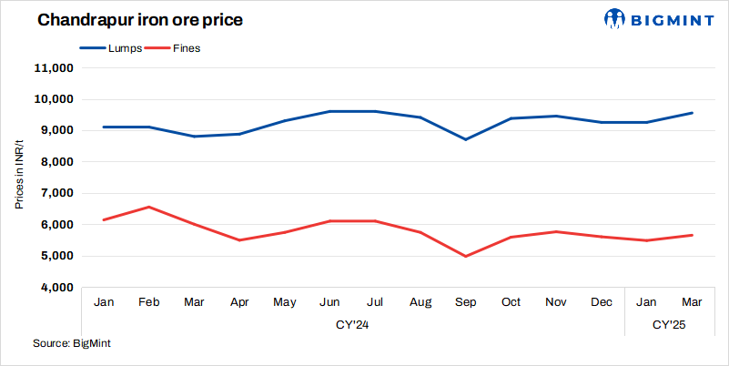 - Iron ore fines (0-10 mm, Fe 63%) offers in Chandrapur, Maharashtra, remained unchanged w-o-w at INR 5,650/t ($66/t) FOR Balharshah on 11 Apr’25. Meanwhile, lumps offers stood stable at INR 9,550/t ($111) FOR Chandrapur.