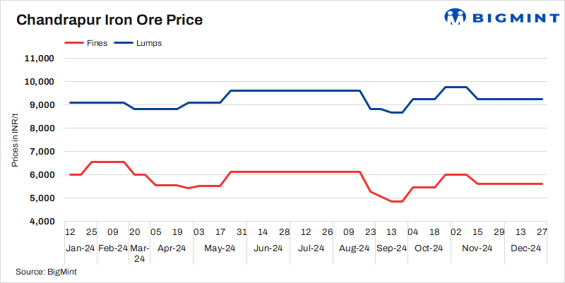 • Iron ore fines (0-10 mm, Fe 63%) and lumps (5-18 mm, Fe 63%) offers in Chandrapur, Maharashtra, stood firm w-o-w at INR 5,600/t FOR Balharshah and INR 9,250/t FOR Chandrapur respectively on 27 Dec’24.