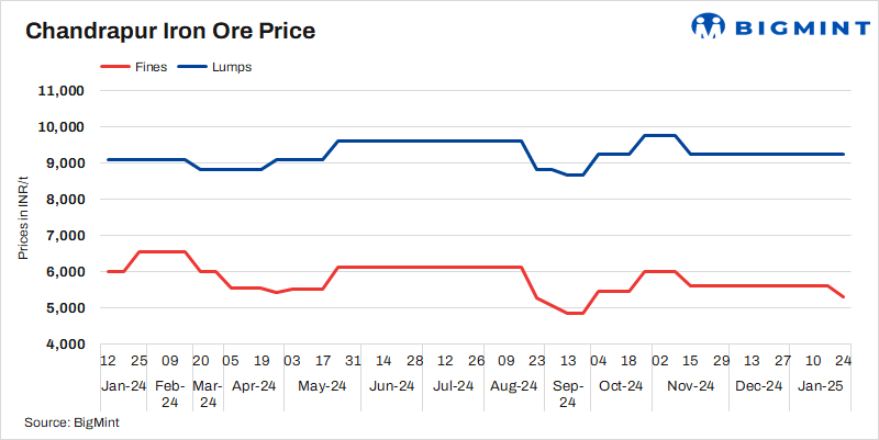 - Iron ore fines (0-10 mm, Fe 63%) offers in Chandrapur, Maharashtra, fell by INR 300/t w-o-w to INR 5,300/t FOR Balharshah as against INR 5,600/t on 17 Jan’25.