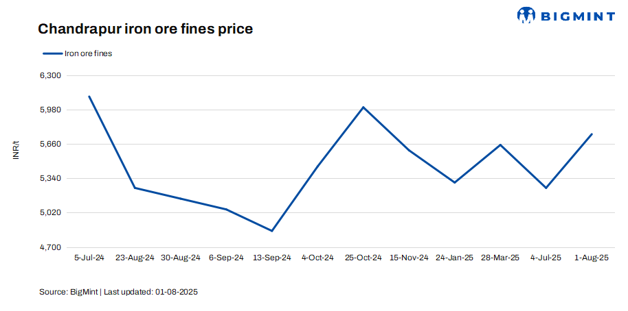 • Iron ore fines (0-10 mm, Fe 63%) offers in Chandrapur, Maharashtra, rose by INR 500/t ($6/t) w-o-w to INR 5,750/t ($66/t) FOR Balharshah on 1 Aug’25. Similarly, offers for iron ore lumps increased by INR 500/t ($6/t) to INR 9,650/t ($110/t) FOR Chandrapur.