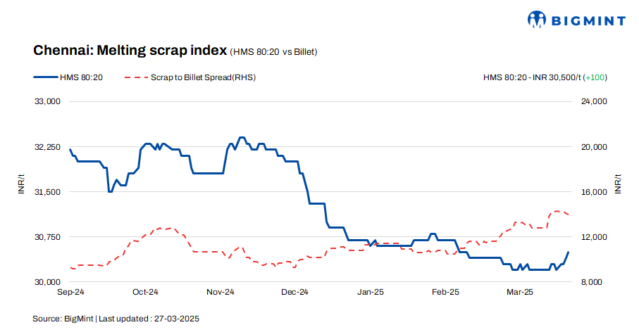 According to a scrap supplier, HMS (80:20) scrap prices in the domestic market are currently trading between INR 30,500-31,500/t, with price variations depending on payment terms. Scrap supply has slowed somewhat due to the ongoing Ramadan festival, which has prompted buyers to offer higher prices to secure material.