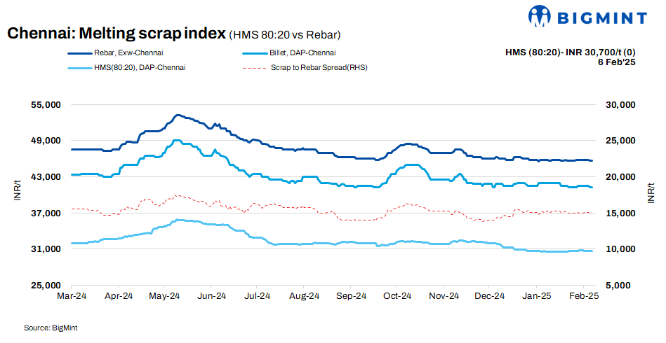 According to BigMint’s latest assessment, prices of HMS (80:20) in Chennai decreased by INR 100/t w-o-w, reaching INR 30,700/t. Despite this drop, prices remained stable on a d-o-d basis. Billet prices held steady d-o-d at INR 41,200/t but experienced a minor reduction of INR 300/t w-o-w. Rebar prices also remained unchanged on a d-o-d basis at INR 45,700/t, but decreased by INR 100/t over the week. Overall, the market sentiment remained cautious along with moderate trade activity.