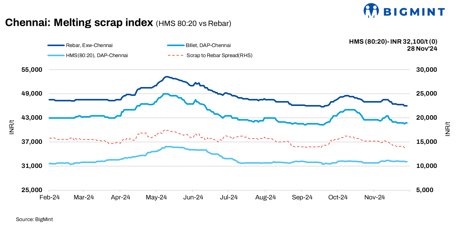 According to BigMint’s latest assessment, HMS (80:20) scrap prices declined INR 200/tonne (t) w-o-w to INR 32,100/t. However, d-o-d, prices remained stable. Meanwhile, rebar tags were unchanged d-o-d at INR 46,000/t but saw a minor reduction of INR 300/t over the week. Additionally, billet offers held steady at INR 41,800/t, both on a d-o-d and w-o-w basis.