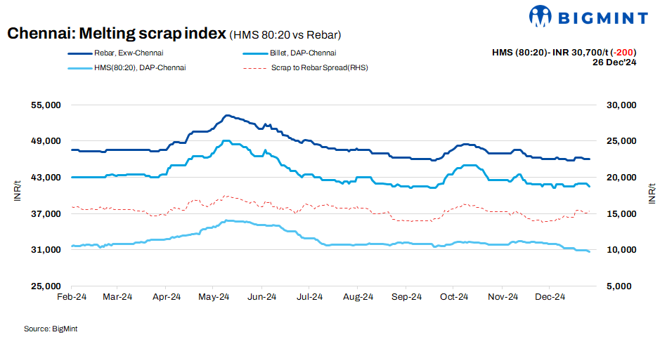 According to BigMint’s latest market analysis, the price of HMS (80:20) has experienced a decrease of INR 200/t on both a w-o-w and d-o-d basis, settling at INR 30,700/t in Chennai, India. In contrast, billet prices have shown a reduction of INR 500/t on a d-o-d basis, bringing the price to INR 41,500/t. On a w-o-w basis, billet prices dropped by INR 400/t.