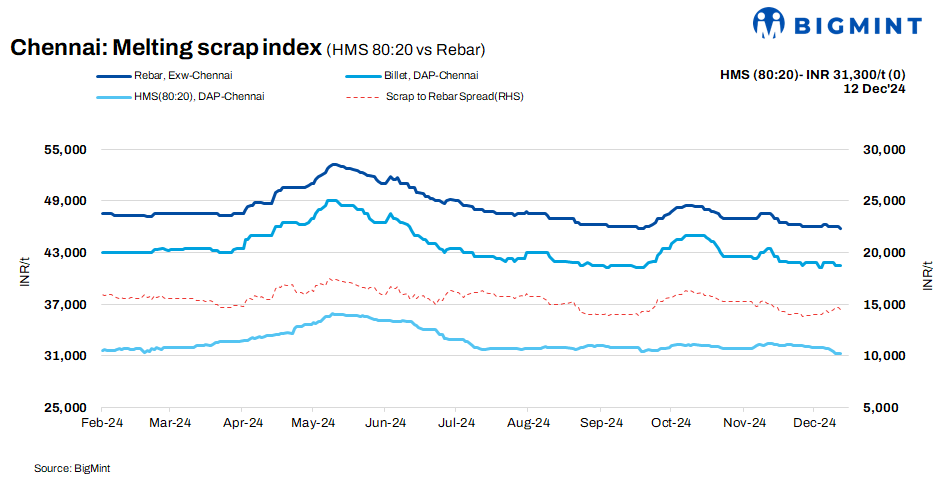 According to BigMint’s latest assessment, HMS (80:20) prices dropped INR 700/t w-o-w to INR 31,300/t in Chennai, India. However, prices remained unchanged d-o-d. Similarly, billet tags decreased by INR 300/t w-o-w to INR 41,500/t while remaining stable d-o-d. Rebar also dropped by INR 400/t w-o-w to INR 45,800/t, with a decline of INR 200/t d-o-d.