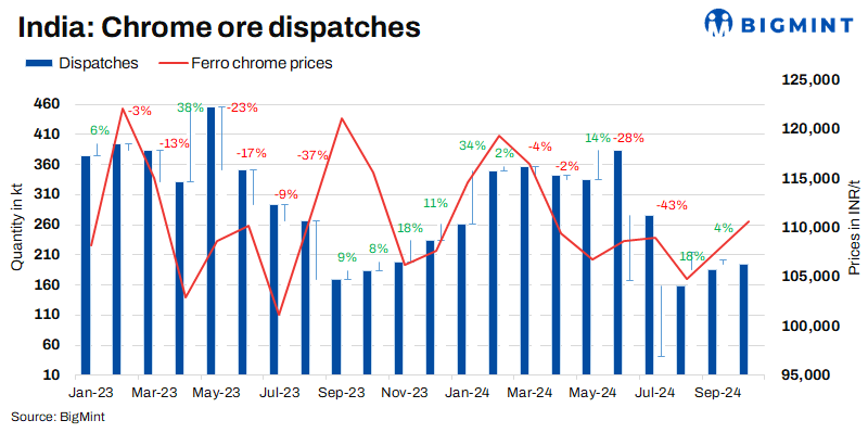 Indian chrome ore dispatches increased marginally by 4% m-o-m in October 2024 to 194,091 tonnes (t), compared to 185,752 tonnes (t) in September. This rise was driven by a slight improvement in ferro chrome prices, which edged up by INR 2,781/t ($33/t) m-o-m in October, boosting demand for chrome ore. Additionally, increased dispatches from Tata Steel and FACOR contributed to the higher figures.