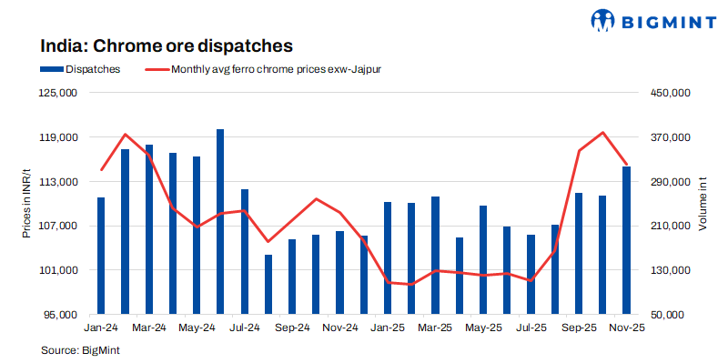 India: Chrome ore dispatches rise 20% m-o-m in Nov’25