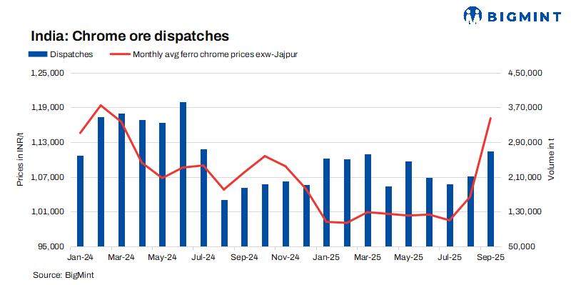 India’s chrome ore dispatches increased by 27% m-o-m to 269,965 t in September 2025 from 211,737 t in August. The increase was supported by a rise of around INR 13,500/t ($152/t) m-o-m in ferro chrome prices to INR 117,100/t ($1,321/t) exw-Jajpur in September, along with strong buying interest at the Odisha Mining Corporation (OMC) chrome ore auction on 19 September, where bids were 3-26% higher than base prices across grades.