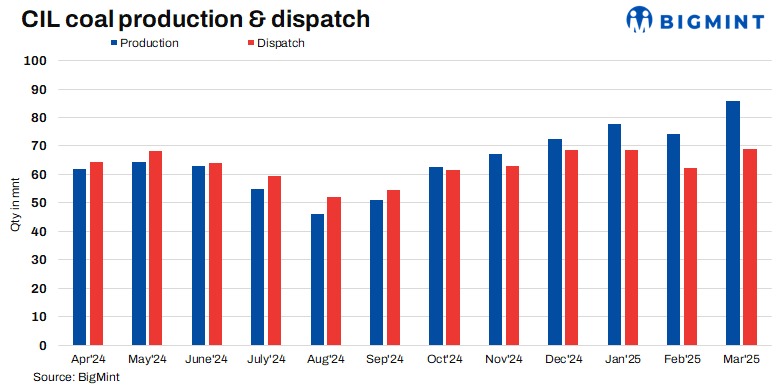 In March, CIL produced 85.8 mnt of coal, a 3.1% y-o-y decrease from the 88.6 mnt in March 2024. However, coal dispatches for the month totaled 69 mnt, a minor 0.3% increase y-o-y.