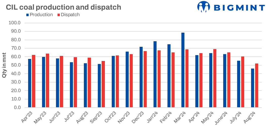 In August, CIL’s total coal production for the month was 46.1 million tonnes (mnt), reflecting an 11.9% y-o-y decrease in coal production. The drop in production is attributed to operational challenges across some of its subsidiaries.