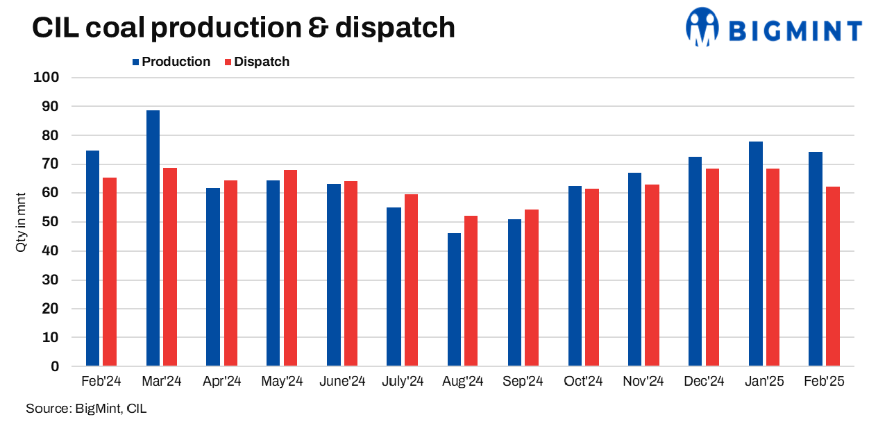 During the same period, total coal offtake reached 693.4 mnt, marking a 1.3% y-o-y rise, indicating stable supply performance. In February, CIL produced 74.1 mnt of coal, which represents a 0.8% y-o-y decline. Coal dispatches for the month were recorded at 62.1 mnt, reflecting a 4.8% y-o-y decrease.