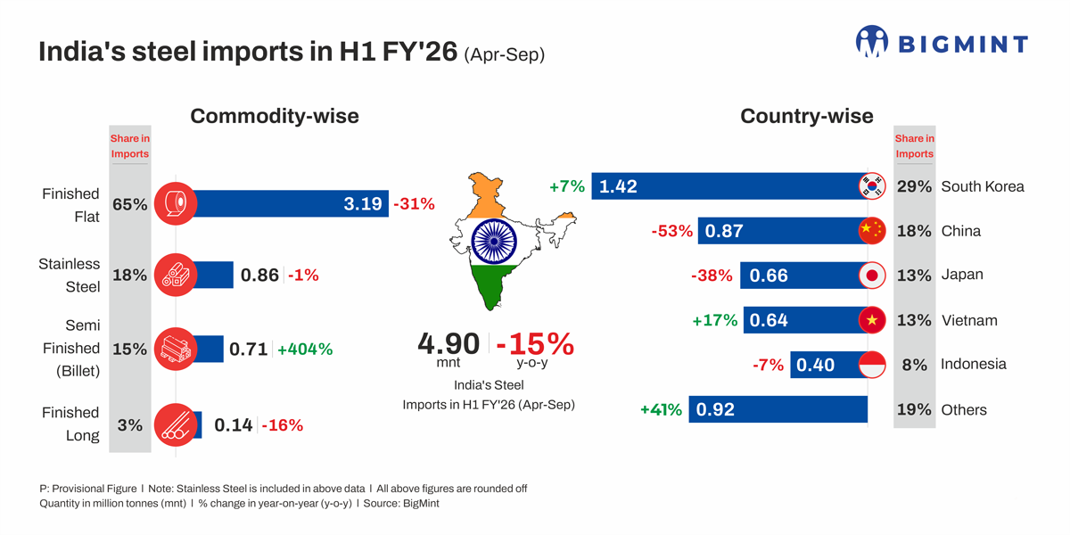 Morning Brief: Indian steel imports (including stainless steel) dropped by 15% y-o-y in H1FY’26, with stricter trade norms stalling inflows from key regions. Imports totalled 4.90 million tonnes (mnt) in H1FY’26 compared to 5.78 mnt in the year-ago period, as per provisional data maintained with BigMint.