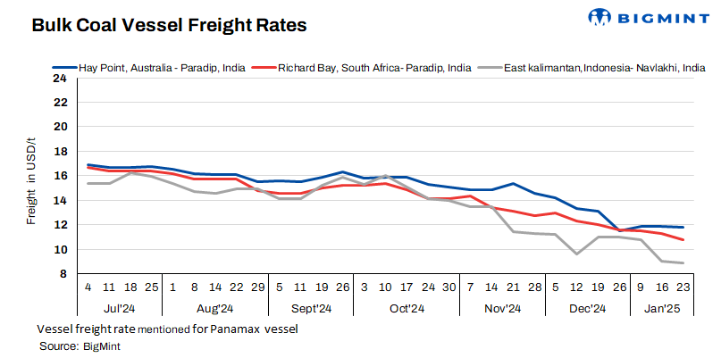 - South Africa-India freights drop w-o-w: Freights from the Richards Bay Coal Terminal (RBCT) to Paradip stood at $10.8/t, down by $0.5/t w-o-w. BigMint observed that a decline in freight rates is primarily driven by limited trading activity and a lack of new fixtures in the market, which has further dampened demand.