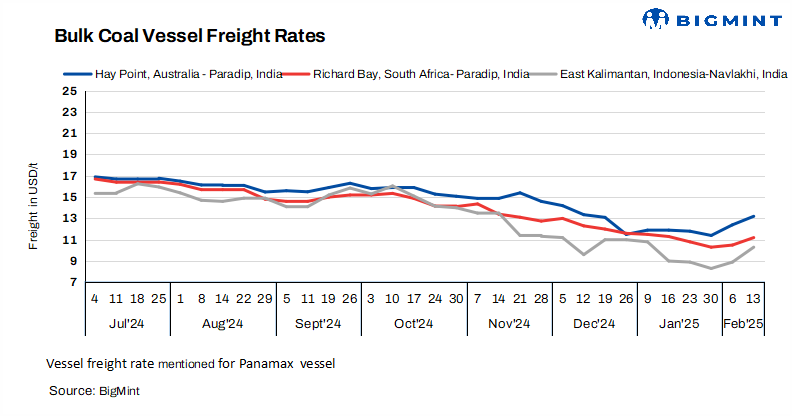 - Australia-India rates rise w-o-w: Freights from Australia to India rose by $0.8/t w-o-w, with BigMint’s assessment indicating that rates for Hay Point Port to Paradip were at $13.2/dry metric tonne (dmt). Sources informed that SAIL booked one Panamax vessel from Australia to Vizag at $14.15/t, with shipment scheduled for 5- 14 March.