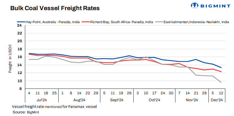 - Australia-India rates fall w-o-w: Freights from Australia dropped $0.85/tonne (t) w-o-w, with BigMint’s assessment indicating that rates for Hay Point Port to Paradip were at $13.35/dry metric tonne (dmt). Sources informed that SAIL booked a Panamax vessel from Hay Point Port to Vizag at $14.10/t, with shipment scheduled for 15-24 January 2025.