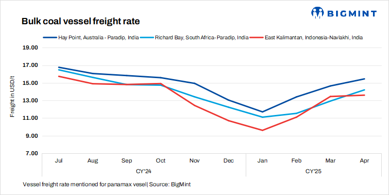• Australia-India rates decline: Freights from Australia to India dropped by $1.10/tonne (t) w-o-w, with BigMint’s assessment indicating that rates for Hay Point Port to Paradip were at $14.9/dry metric tonne (dmt). Sources informed that SAIL booked two Panamax vessels from Australia to Vizag at $14.35-14.85/t, with shipment scheduled for 1-14 May.