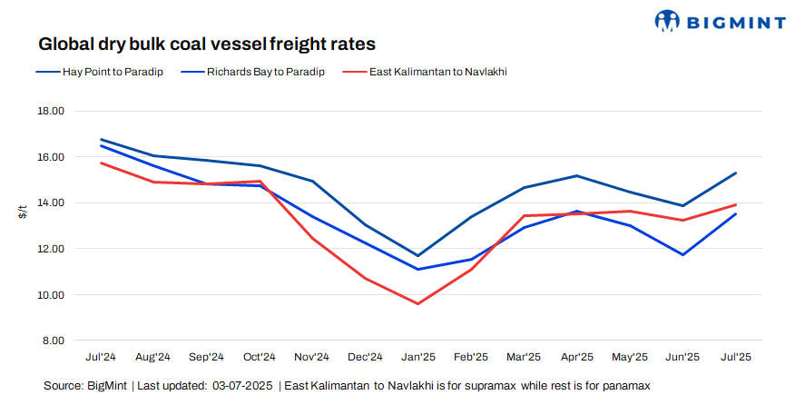 - Australia-India rates increase: Freights from Australia to India rose by $0.6/t w-o-w, with BigMint’s assessment indicating that rates for Hay Point Port to Paradip were at $15.3/dry metric tonne (dmt). Sources informed that one Panamax vessel was booked from Australia to Gangavaram at $15.90/t, with shipment scheduled for 25 July-3 August.