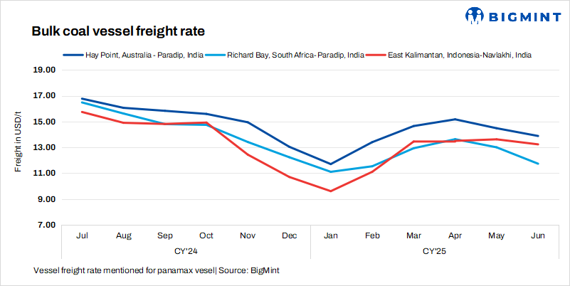 - Australia-India rates rise: Freights from Australia to India rose by $0.6/t w-o-w, with BigMint’s assessment indicating that rates for Hay Point Port to Paradip were at $14.1/dry metric tonne (dmt). Sources informed that RINL booked two Panamax vessels from Australia to Gangavaram at $16.85-17.05/t, with shipment scheduled for 11-25 July.