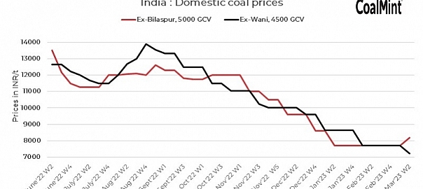 Prices of 4,500 GCV coal in Wani stood at INR 7,225/t on 18 March, a decrease of INR 475/t w-o-w, while 5,000 GCV coal was assessed at INR 8,200/t in Chhattisgarh’s Bilaspur, an increase of INR 500/t w-o-w.
