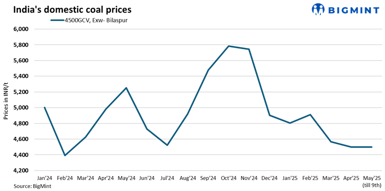 Domestic coal prices remained unchanged this week, with 4500 GCV and 5000 GCV grades assessed at INR 4,500/t and INR 4,950/t, respectively, exw-Bilaspur.