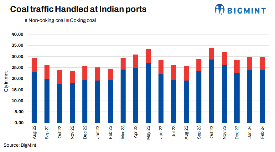 Total coal traffic (including coking and non-coking) handled at Indian ports stood at 29.79 million tonnes (mnt) in February 2024, down 4% m-o-m from 30.98 mnt in January, as per BigMint data.