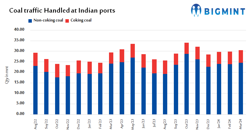 Total coal traffic (including coking and non-coking) handled at Indian ports stood at 30.52 million tonnes (mnt) in March 2024, up by 2% m-o-m from 29.79 mnt in February 2024, as per BigMint data.