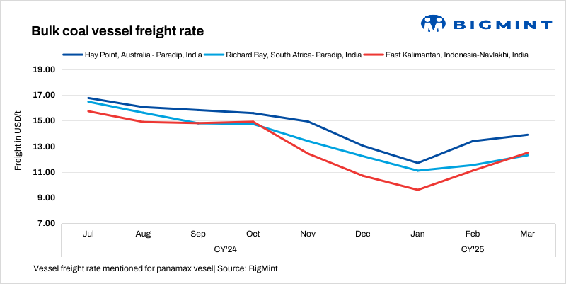 - Australia-India rates drop w-o-w: Freights from Australia dropped $0.6/tonne (t) w-o-w, with BigMint’s assessment indicating that rates for Hay Point Port to Paradip were at $13.9/dry metric tonne (dmt).