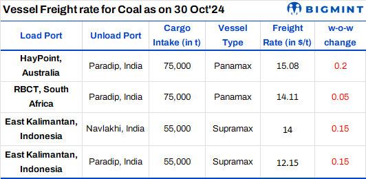 India’s coal vessel freights fell w-o-w on lower demand. Inquiries remained limited ahead of the Diwali festival. South African coal demand has also remained sluggish weighing on trades. Freights from Hay Point Port to Paradip stood at $15.08/dmt, down $0.2/t w-o-w, while from the Richards Bay Coal Terminal (RBCT) rates to Paradip were at $14.11/t, down $0.05/t w-o-w, as per BigMint data.