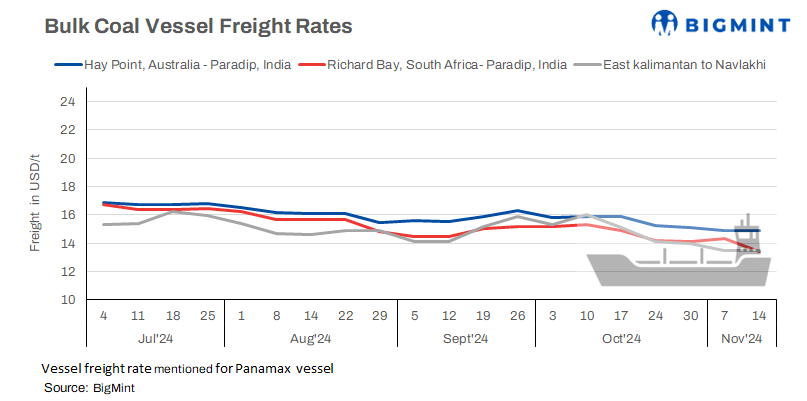 Last week it was heard that South Africa had shut its Lebombo border crossing with neighbouring Mozambique due to escalating violent protests on the Mozambican side over the national election results announced in early October. The Lebombo crossing is a key trucking route for coal from South Africa to the port of Maputo in Mozambique. Maputo port authorities warned stakeholders that a fresh round of protests expected from Wednesday could again disrupt coal shipments. However, the market is yet to see any reflection in freights. - Indonesia-India freight rates stable w-o-w: Freights for coal shipments from East Kalimantan to Navlakhi stood at $13.5/t, stable w-o-w. As per sources, inquiries from Indian buyer for low CV have been recorded keeping freight at similar levels. It is expected that inquiries will be fixed in the near future for December shipment.