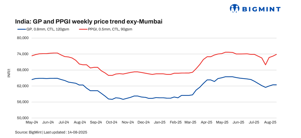 The Indian coated steel market saw GP (galvanised plain) prices remaining stable, while PPGI (pre-painted galvanised iron) prices recorded an increase in the week ending 14 August 2025. Sentiment, however, was mixed, with some participants pointing to improved activity in certain regions, while others cautioned that prices could come under pressure if demand momentum does not sustain in the coming weeks.