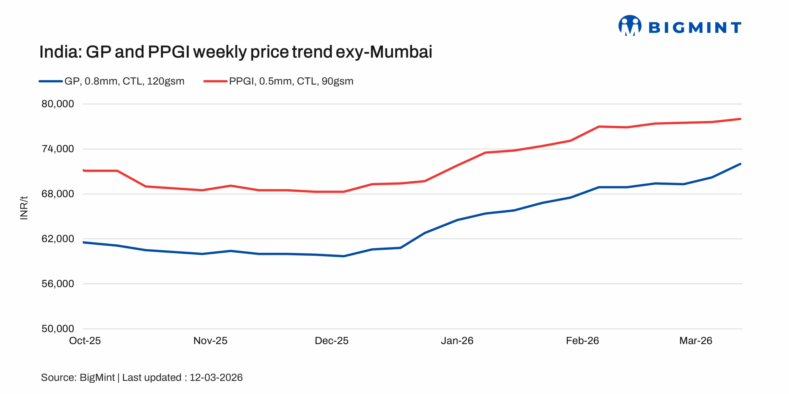 Indian coated flat steel prices moved up w-o-w across segments, supported by recent mill price hikes and tight supply conditions. Prices of galvanised plain (GP) increased by INR 600-1,800/t w-o-w, while pre-painted galvanised iron (PPGI) prices rose by INR 400-1,100/t. Galvalume (BGL) witnessed a sharper increase of INR 1,500-2,800/t during the same period.