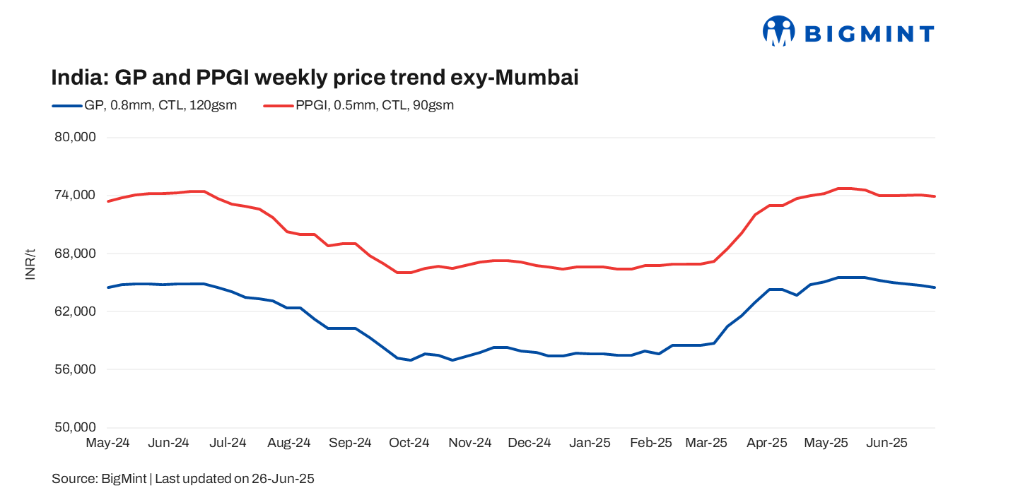 India’s coated flat steel market remained broadly steady this week, though underlying weakness persists amid slowing demand and intensifying monsoon conditions. Demand for colour-coated or pre-painted galvanised iron (PPGI) coils—which had seen a brief boost in the preceding couple of weeks—has started tapering off, as end-buyers are now done with their procurements.