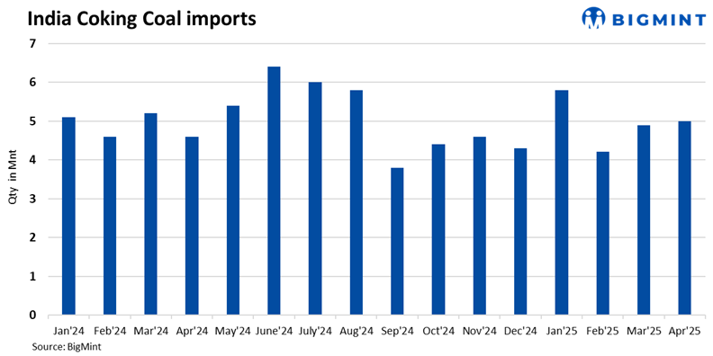 India’s coking coal imports rose 6% to 5.0 million tonnes (mnt) in April 2025 from 4.7 mnt in March, according to BigMint data. The increase was supported by higher shipments from key suppliers such as Australia and Mozambique, though volumes from the US and Russia saw a slight decline.