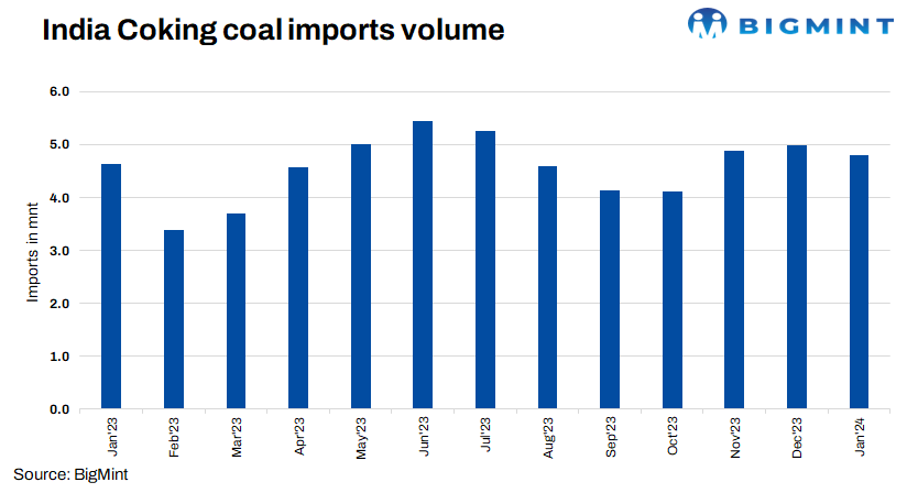 India’s coking coal imports in January’24 fell by 5% to 4.77 mnt as against 4.99 mnt in December’23, as per BigMint data. However, imports surged by 4% y-o-y to 4.80 mnt in January’24 compared to 4.60 mnt in January’23. The drop in India’s coking coal imports can be attributed to reduced demand within the country and subdued buying interest.