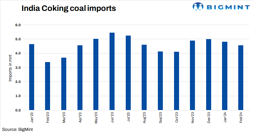 India’s coking coal imports in February 2024 fell by 11% to 4.56 mnt as against 5.12 mnt in January 2024, as per BigMint data. However, imports surged by 35% y-o-y to 4.56 mnt in February 2024 compared to 3.37 mnt in February 2023. The drop in India’s coking coal imports can be attributed to reduced demand within the country and subdued buying interest.