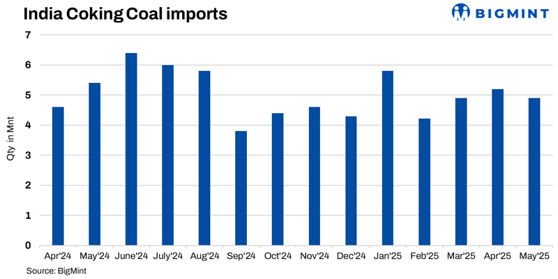 India’s coking coal imports stood at 4.9 million tonnes (mnt) in May 2025, down 6% from 5.2 mnt in April, as per BigMint data. The decline is largely attributed to lower shipments from Australia and the US, despite improved inflows from Russia and Indonesia.