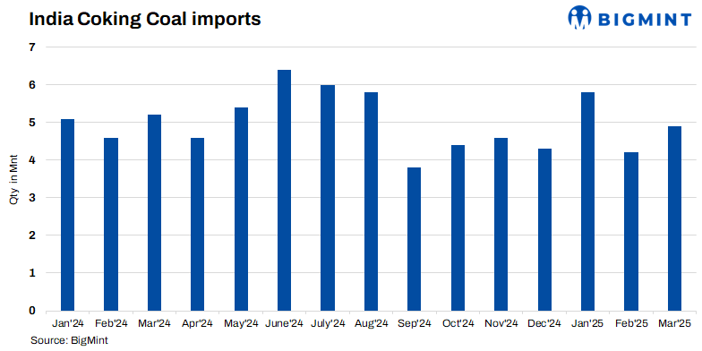 Notably, India’s coking coal imports stood at 4.9 mnt in March 2025, up 23% from 4.0 mnt in February, as per provisional data from BigMint.