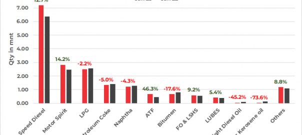 Notably, the top five products consumed during the period in descending order are high speed diesel (HSD), motor spirit (MS), liquified petroleum gas (LPG), pet coke and naphtha. These five products contributed approximately 80% of total consumption of petroleum products.