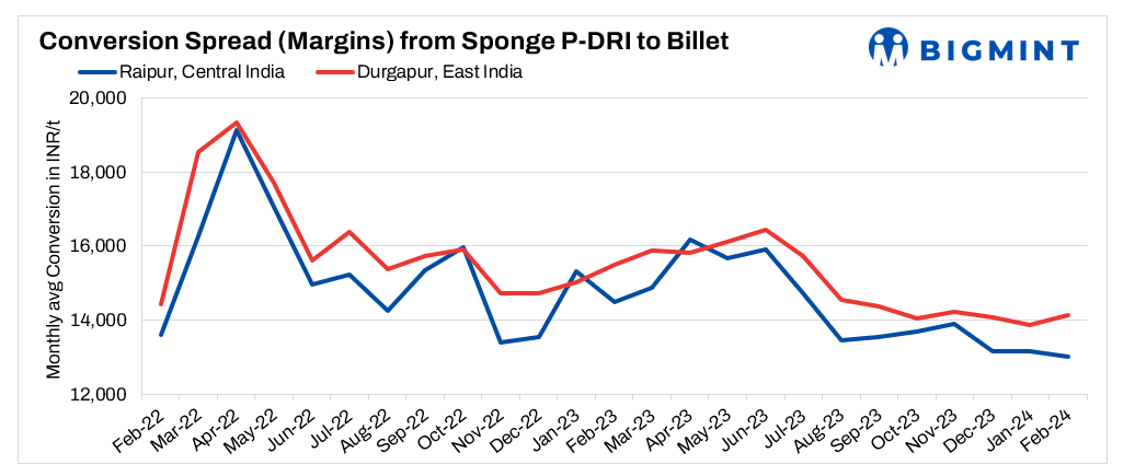 In February 2024, the conversion spread touched a two-year low, echoing levels last seen in February 2022. India’s billet makers saw a 2% rise in conversion spread from sponge iron (PDRI) to billets in Durgapur, while Raipur witnessed a 1% decline during February 2024. BigMint data from February reveals average monthly conversion spreads of approximately INR 13,018/t and INR 14,142/t in Raipur and Durgapur, respectively.