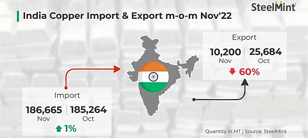 India’s copper imports were largely stable with a slight rise of 1% m-o-m in November, 2022 at 186,665 t from 185,264 t in October, 2022. Imports had been recorded at 211,974 t in November 2021. Therefore, imports fell by 12% y-o-y in November 2022, as per SteelMint’s data.