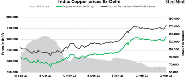 Copper armature scrap prices in Delhi climbed up to INR 712,000/t exy. Primary copper rods saw a 0.3% increase to INR 802,000/t, supported by a 1.56% rise in LME futures to $9,100/t. The gradual increase in buying inquiries from China has bolstered market sentiment, which is also being reflected in the domestic market. Sources predict that prices will remain elevated in the near future.