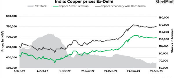 Copper armature scrap prices in Delhi increased today to INR 698,000/t exy. Primary copper rods prices moved up by 0.4% to INR 802,000/t on healthy buying enquiries amid a rise in LME futures while secondary rods prices rose to INR 752,000/t exy. Sellers are trying to hold back offers whereas buyers have raised bids on growing demand, sources informed.